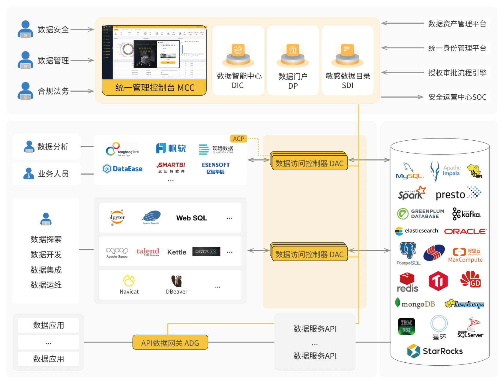 数据开发、治理、集成和运维人员拥有高权限的数据源账号和访问凭据,日常工作中能够接触大量的敏感数据,容易造成数据越权访问、敏感数据泄露等问题,数据脱敏保护、数据安全审计等技术手段缺失。同时,数据开发运维人员普遍存在数据源账号共享使用的问题,发生数据安全事件时无法追溯到真实个人身份。